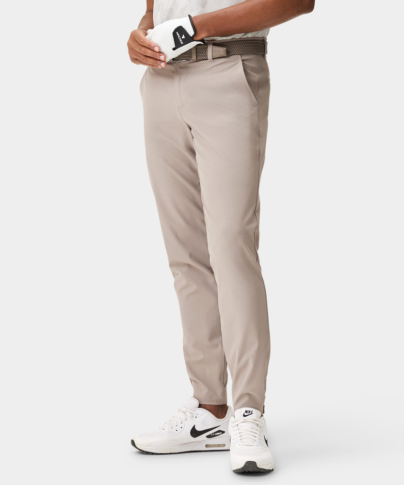 Propracované joggery, které nabízejí výkonnostní pružnost a stálý tvar při každém kroku i švihu. Detaily jako žebrované manžety u kotníků a vnitřní silikonový pas jim dodávají čistý, upravený vzhled.