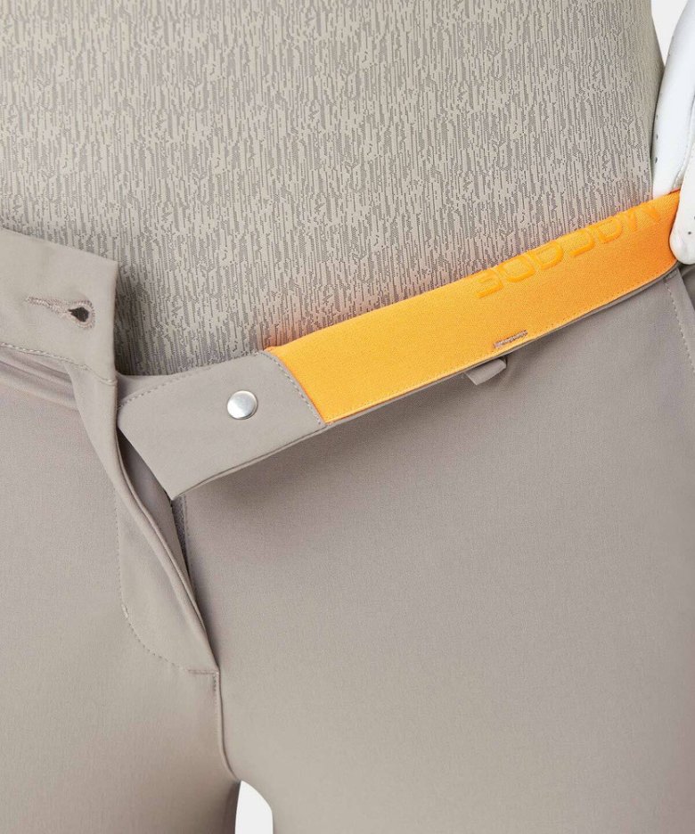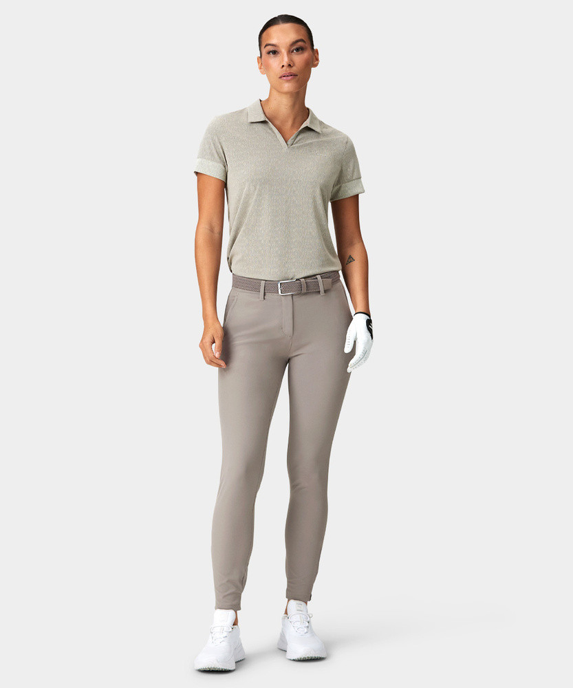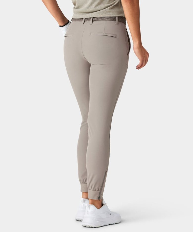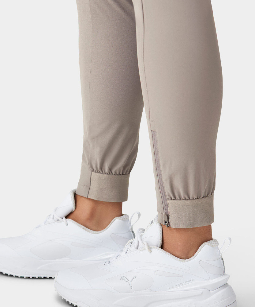 Joggery jsou ušity z lehkého čtyřsměrně strečového materiálu, který umožňuje maximální volnost pohybu. Žebrované manžety na kotnících jsou doplněny zipem pro snadné oblékání a elastický pas má protiskluzové silikonové lemování, které udrží tričko úhledně na místě. Perfektní sportovní alternativa ke klasickým golfovým kalhotám.